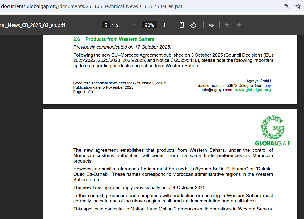 Am 17. Oktober 2025 teilte GLOBALG.A.P. seinem Netzwerk mit, dass „die neuen Kennzeichnungsvorschriften vorläufig ab dem 4. Oktober 2025 gelten” und dass Unternehmen, die aus der Westsahara importieren, „in allen Produktunterlagen und auf allen Etiketten” eine der Verwaltungsregionen Marokkos als Herkunftsort „korrekt angeben müssen”.