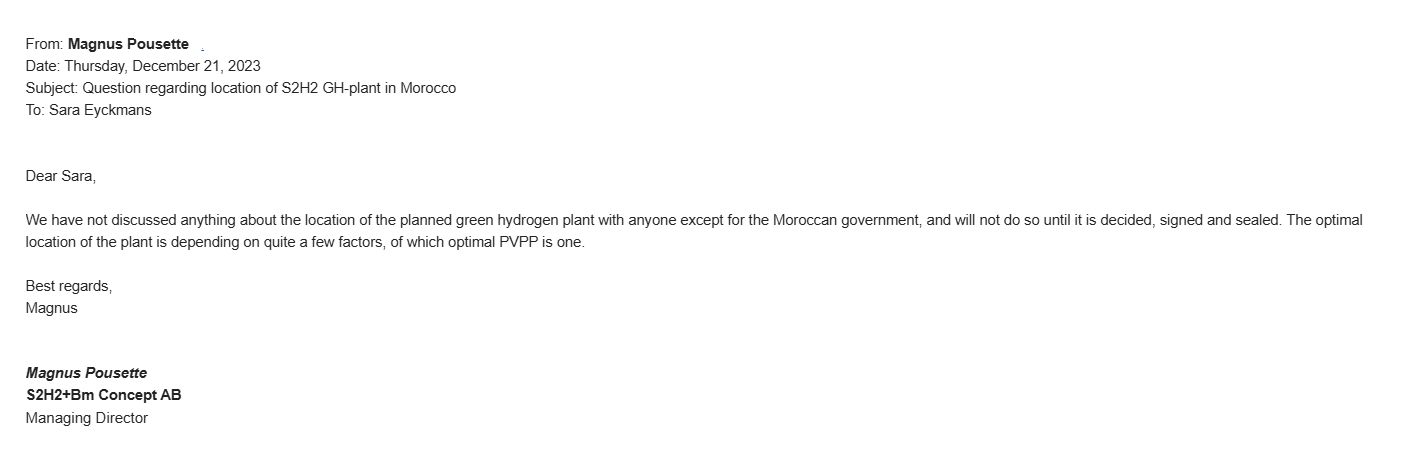 Swedish company S2H2+Bm Concept AB has so far refused to clarify whether its planned green hydrogen plant will be located in Morocco proper or in occupied Western Sahara.