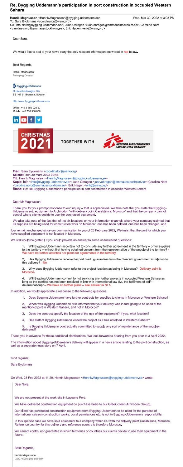 Q: Will Bygging Uddemann commit to not servicing any further projects in occupied Western Sahara as long as the conflict has not been resolved in line with international law (i.e. the fulfilment of self-determination)?