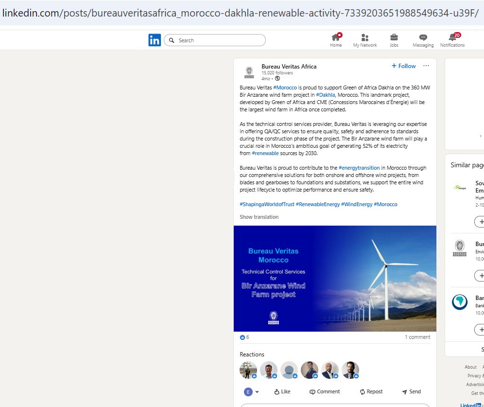 Bureau Veritas hat seine Beteiligung an dem umstrittenen Windenergieprojekt Bir Anzarane in der besetzten Westsahara bekannt gegeben. Die Nachricht, die kürzlich in einem LinkedIn-Beitrag veröffentlicht wurde, zeugt von der anhaltenden Missachtung der rechtlichen und ethischen Implikationen der marokkanischen Besatzung des Gebiets durch das Unternehmen.