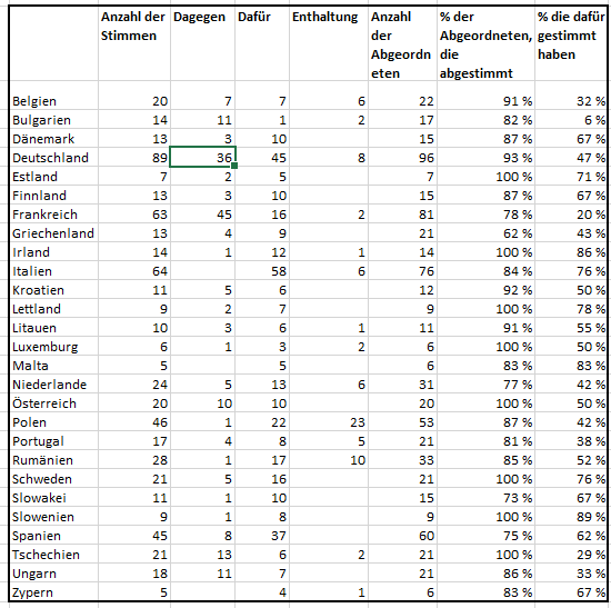 Die folgende Übersicht berücksichtigt, dass vier Abgeordnete ihre Stimmen kurz nach der Abstimmung im Plenum korrigiert haben: Kelleher (Renew) und Tonin (EVP) änderten ihre Stimme von „dagegen” zu „dafür”; Falcone (EVP) änderte seine Stimme von „dafür” zu „Enthaltung”; González Casares (S&D) änderte seine Stimme von „dafür” zu „dagegen”.
