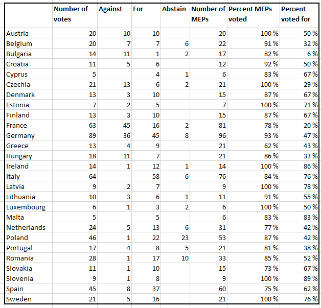 The overview below takes into account that 4 MEPs corrected their votes shortly after the vote in plenary: Kelleher (Renew) and Tonin (EPP) changed from “against” to “in favour”; Falcone (EPP) changed from “in favour” to “abstain”; González Casares (S&D) changed from “in favour" to “against”)