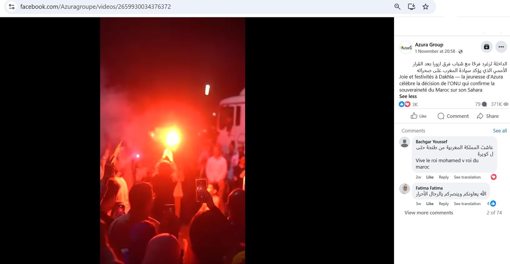 Dans une vidéo publiée sur le compte Facebook d'Azura, on aperçoit des jeunes hommes brandissant des drapeaux marocains et des portraits du roi dans la rue, ainsi que des affiches d'Azura (télécharger la vidéo). « La jeunesse d'Azura célèbre la décision de l'ONU qui confirme la souveraineté du Maroc sur son Sahara », peut-on lire.